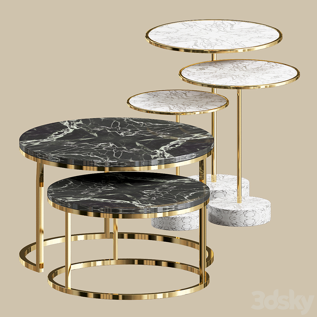 L'ensemble comprend deux parties distinctes : un ensemble de tables gigognes intégrées en marbre noir et trois petites tables longues en marbre blanc.